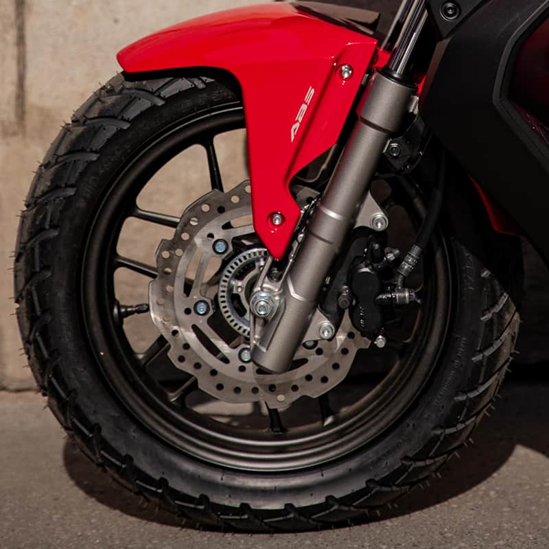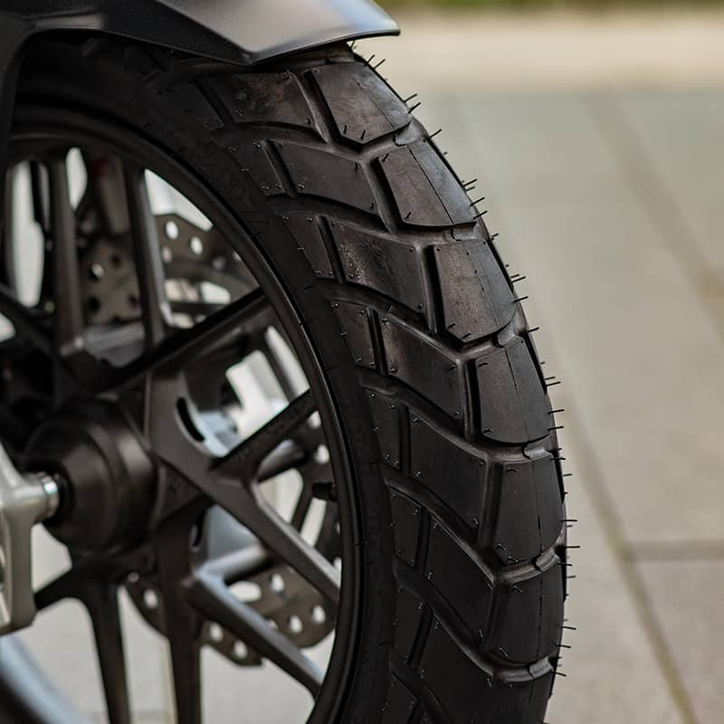 Ban lebar berukuran 110/80-14 (F) & 130/70-13 (R) dengan semi dual purpose pattern untuk melewati berbagai kondisi jalan.