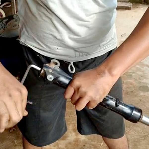 - Lepaskan roda depan dengan membuka mur as roda menggunakan kunci sok/ring 17 & 19 agar roda depan dapat dilepas.